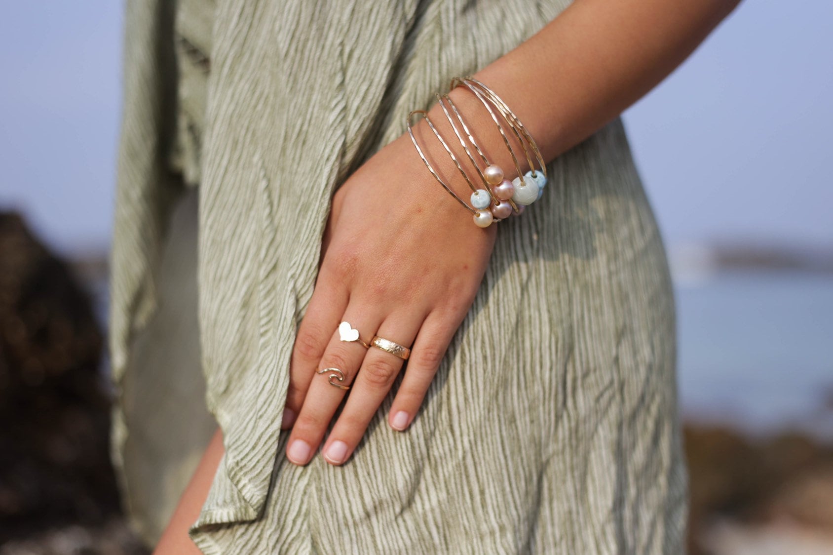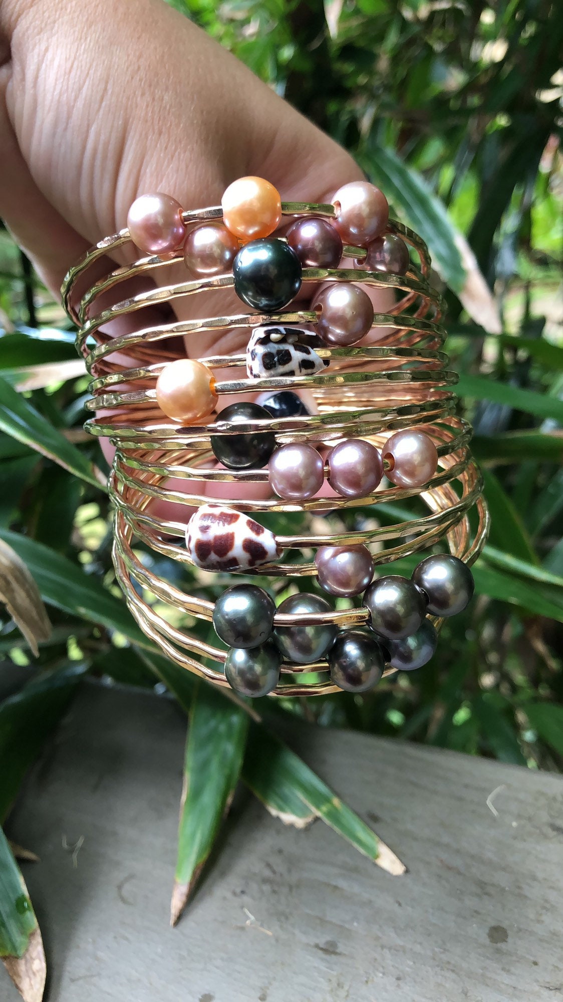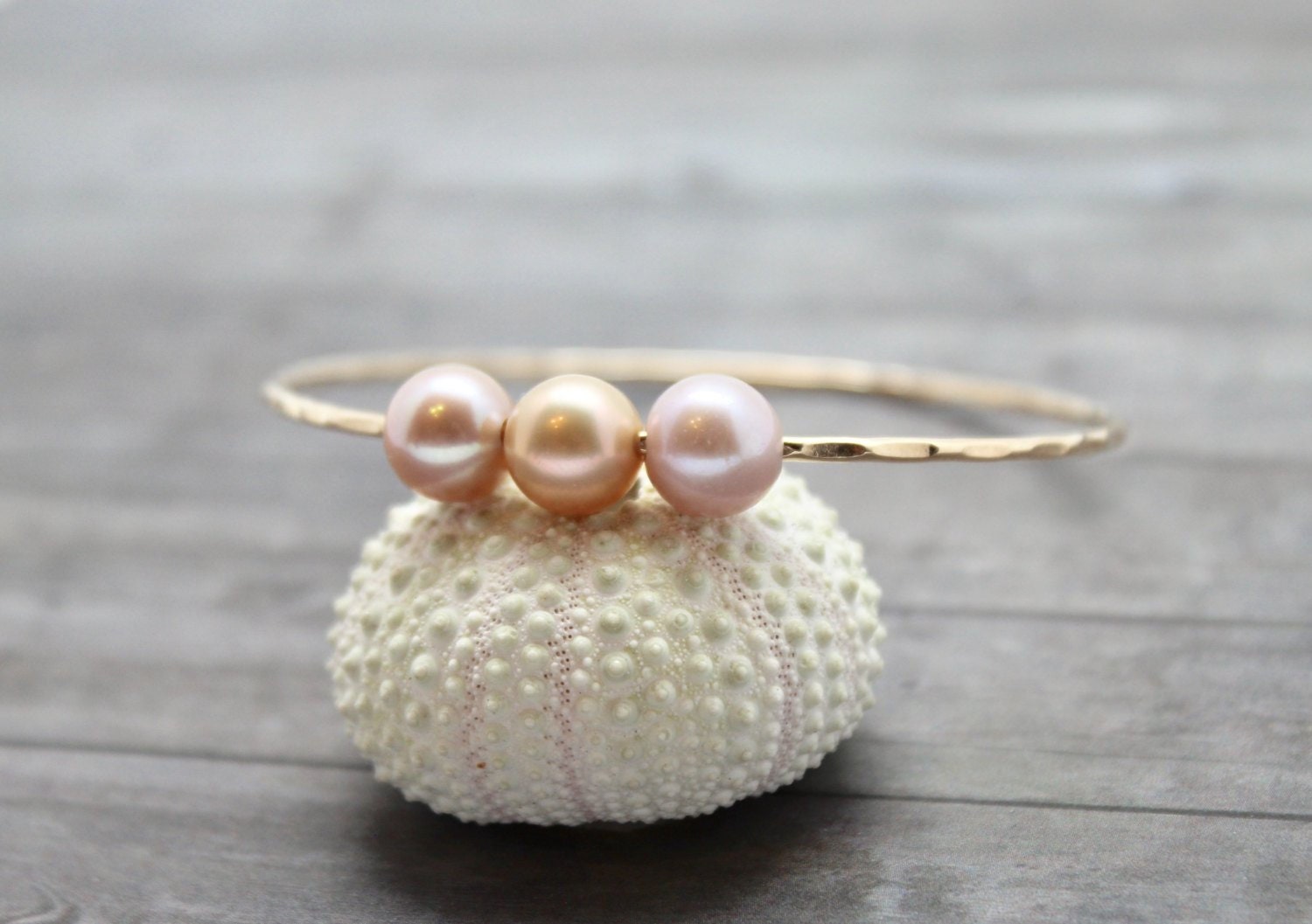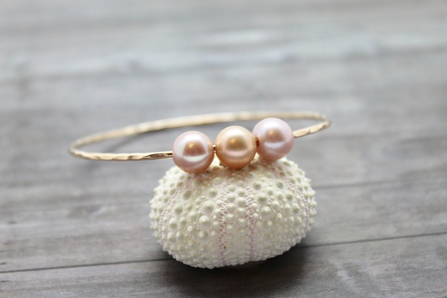 This listing is for one hand forged and hammered bangle adorned with three gorgeous 9mm Pink Edison Pearls. Available in both Sterling Silver and 14K Goldfill.